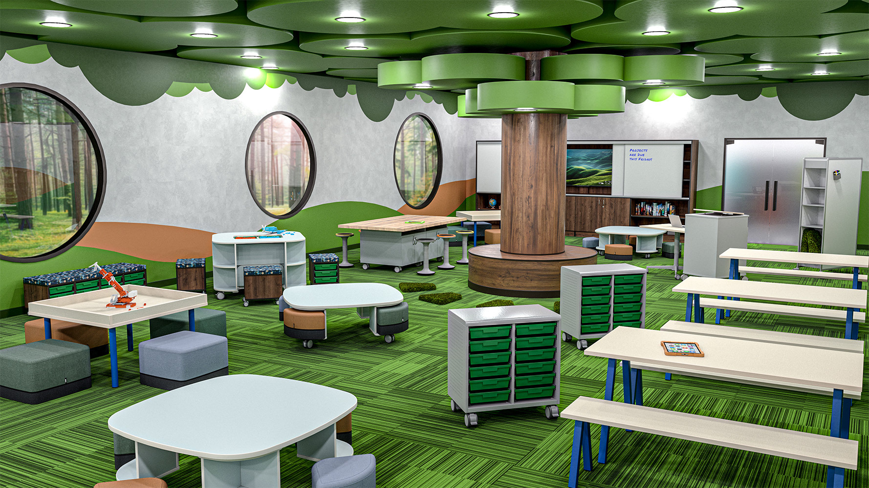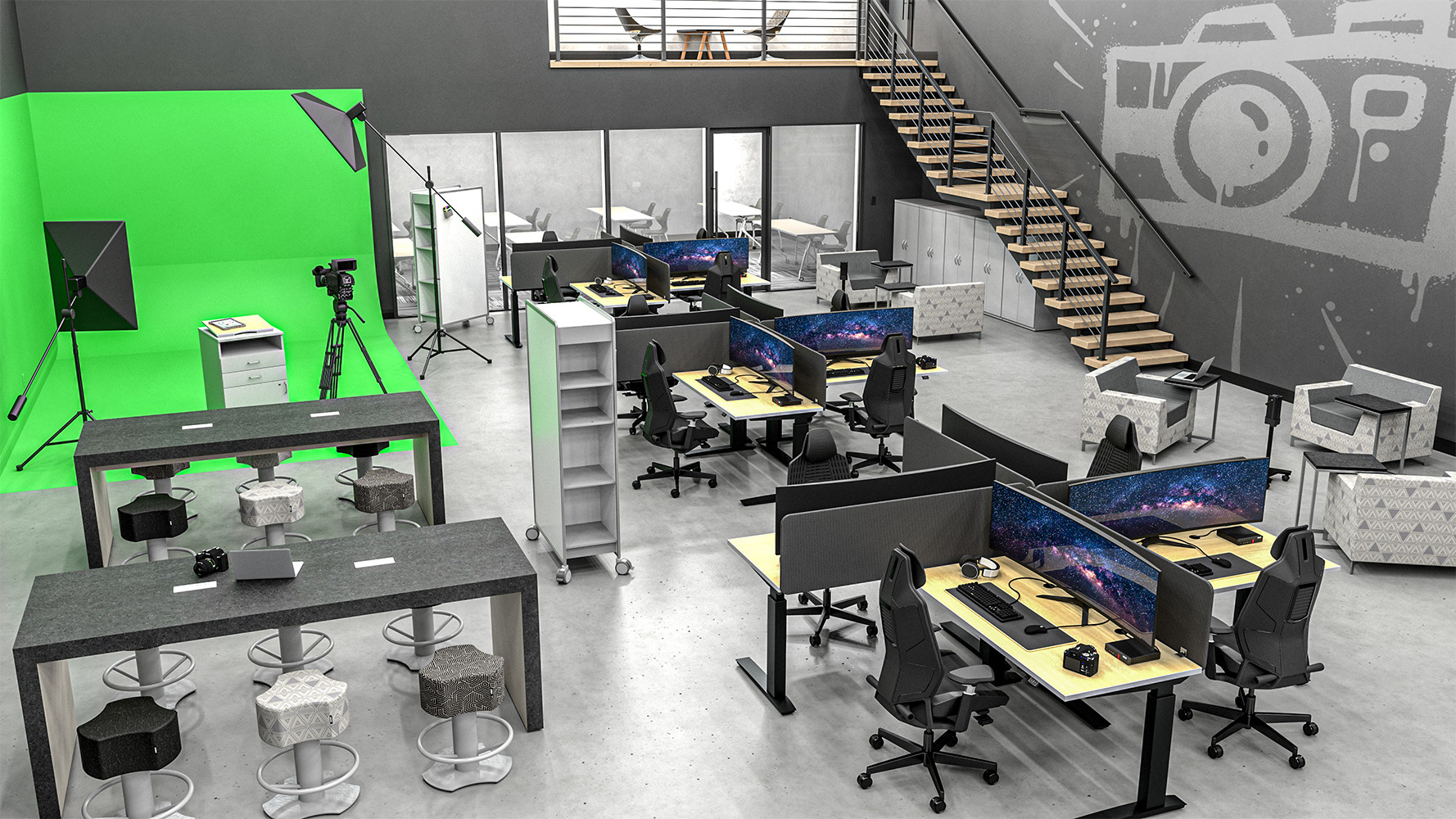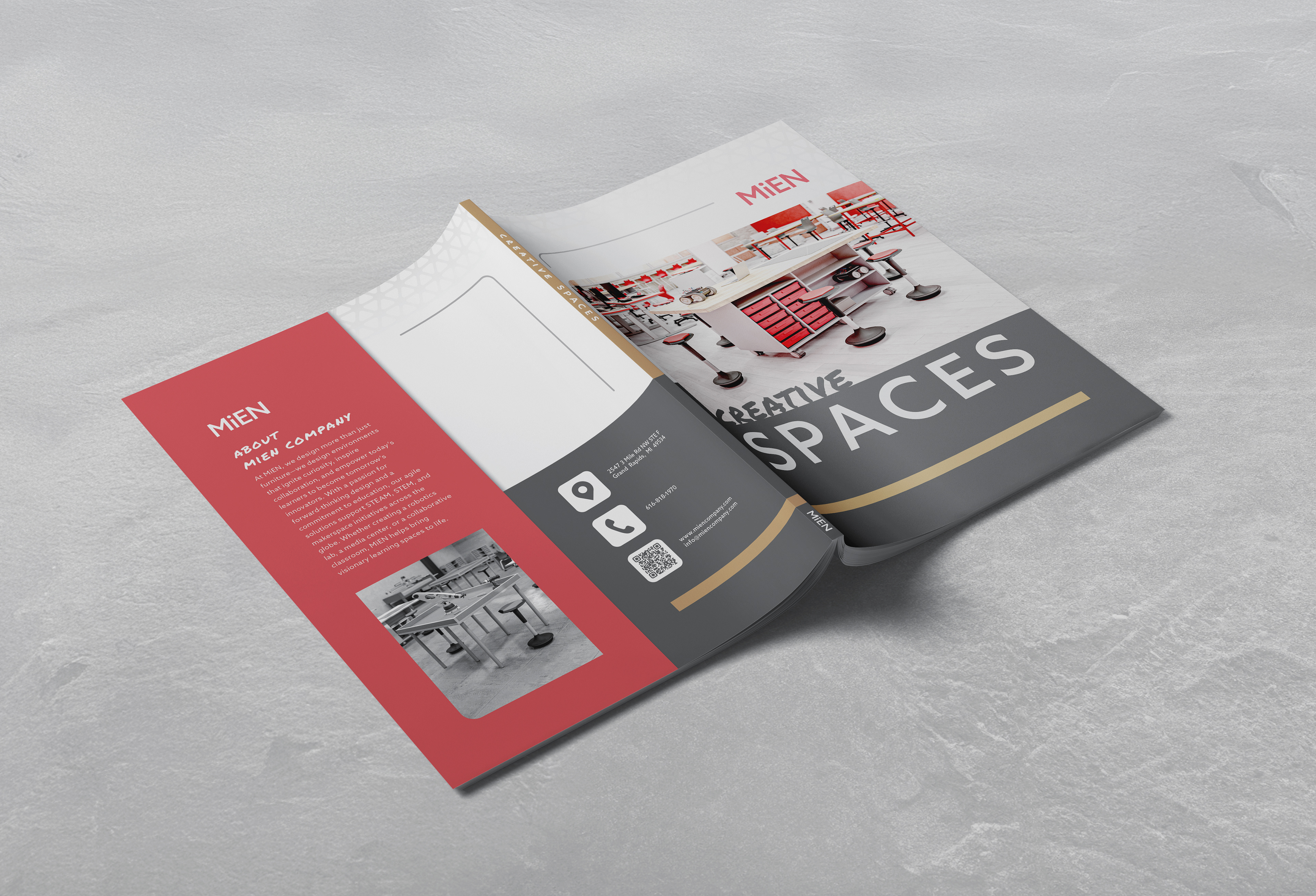 A marketing brochure and visual rendering series created for MiEN Company to showcase furniture solutions for makerspaces, STEM environments, art rooms, and esports spaces.